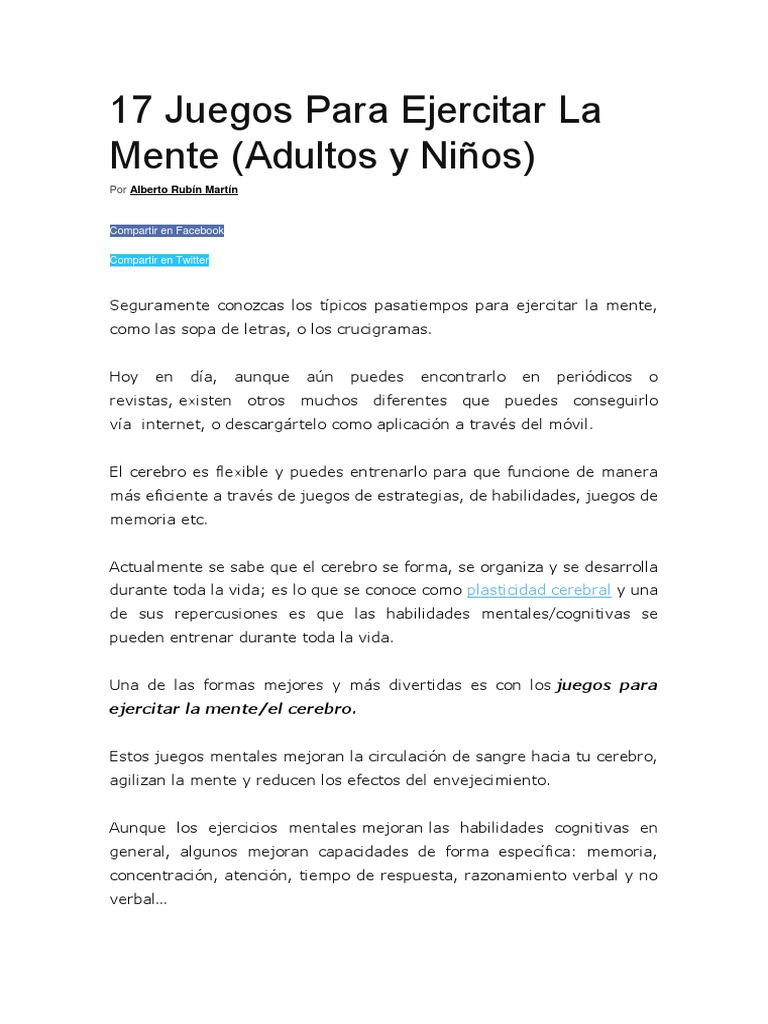 Los jóvenes de antes, memorizaban los teléfonos de sus amigos, para poder llamarles. Cuidado con las trampas mentales que nos ponemos a veces. Los acertijos te harán explotar tus neuronas. Importancia de resolver acertijos mentales: Si continúa navegando, consideramos que acepta su uso. Análisis estadísticos sobre los hábitos de navegación de nuestros usuarios para mostrarles publicidad relacionada con sus preferencias, y facilitar la interacción con redes sociales. Al igual que haces ejercicio para no oxidarte, tu cerebro también necesita mantenerse en forma mientras trabajas desde casa o aprendes nuevas habilidades. Aquí te describimos cinco juegos para comenzar el entrenamiento mental con tu perro: Juegos mentales para niños y adultos los mas difíciles. Este video de juegos mentales pondrá a prueba tu mente y tu habilidad para resolver problemas. Las adivinanzas y acertijos de lógica también ayudarán a los niños a asociar ideas y enriquecerán su vocabulario. 50 juegos de mesa educativos que deberian estar en todas las aulas y casas los juegos de mesa son una excelente alternativa para regalar en cualquier momento del ano. 60 divertidos juegos mentales para mantener tu cerebro en forma!